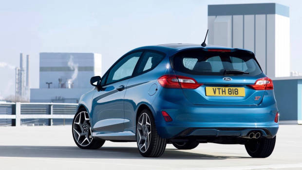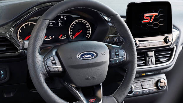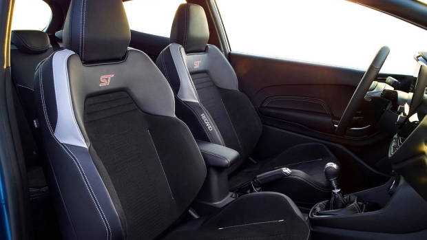 Elsewhere, the Fiesta ST adds a dose of sportiness to the new Fiesta’s design. There are deeply bolstered Recaro sports seats, a flat-bottomed ST-branded sports steering wheel, an aggressive mesh sports grille, a large rear spoiler, sporty twin tailpipes and large 18-inch alloy wheels.