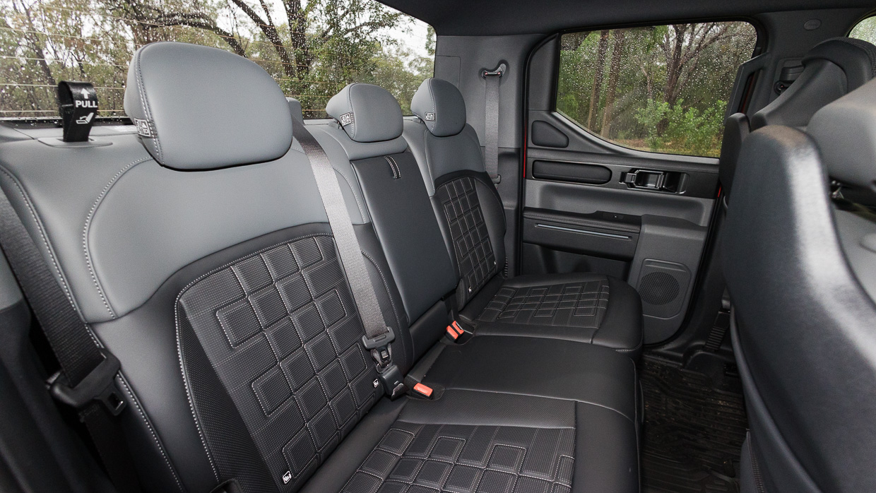 The sense of space in the front and rear is fantastic, and the Tasman’s twin 12.3-inch screens, 5.0-inch HVAC display and knurled physical switches combine for seamless, lag-free interaction. Not something evident in any other ute on test.