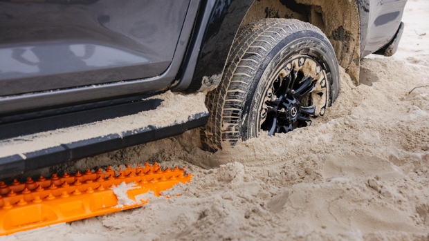 No luck? Grab those recovery boards. Clear the sand from around the tyres again (you can use the recovery boards to help with this by the way) and make enough of a hole so the boards can slot under part of the tyres.