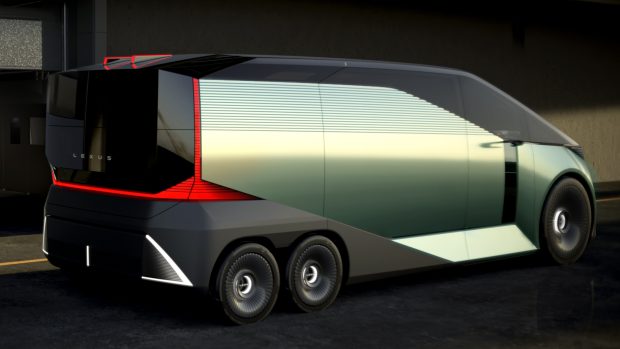 Outside, a new take on the Lexus spindle grille is framed by extended LED running lights and backlit logotype, though the star of the show is the imposing and brutalist side profile with extensive bodywork atop six transparent multi-spoke wheels.