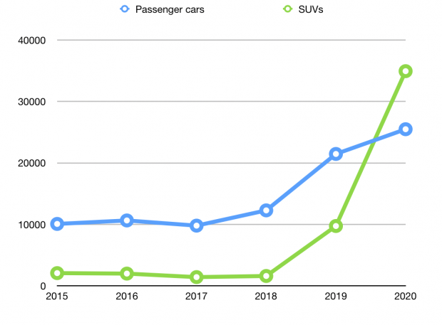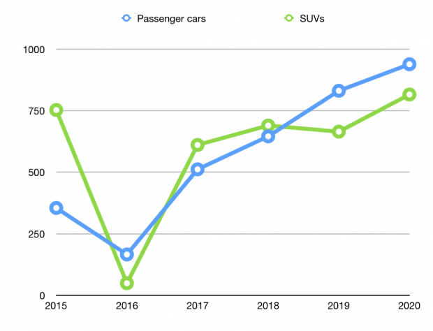 Meanwhile, in full EVs, the story is murkier. Without any data relating to Tesla sales, the limited numbers – 939 EV cars in 2020, and 816 EV SUVs – represent the small number of non-Tesla BEVs on the market.