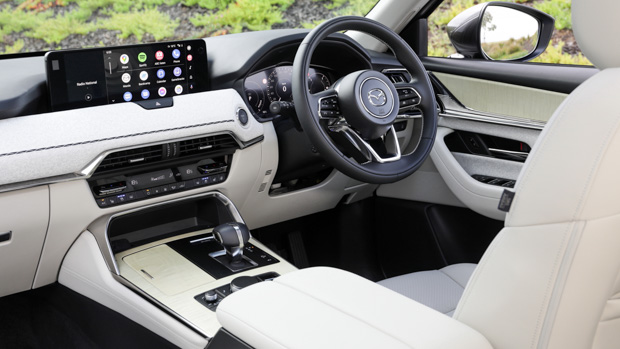 In the CX-60’s case, that combo blends a 141kW four-cylinder petrol, a 100kW electric motor, and a 17.8kWh battery to provide around 60km of electric driving range before the engine is needed. Combined outputs are 241kW/500Nm – the highest ever for a production Mazda.