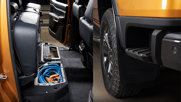 The rear seats flip up to reveal more space underneath without compromising the ability to fold them back down in place. Alternatively, the back of the seat can be folded down to provide a flat surface for storage.
