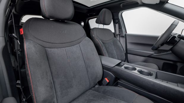 Interesting and soft materials are on display in the Ioniq 3’s cabin, including ’70s-style pleated upholstery on the dash.