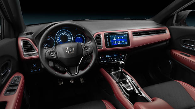 The interior of the HR-V Sport features newly-designed front seats for greater support in all driving, while an available red and black leather and cloth trim combination is also available. A new variable-ratio steering rack has also been fitted for greater steering response and handling. The 2019 Honda HR-V Sport also features a darker black headliner for a sportier cabin look.