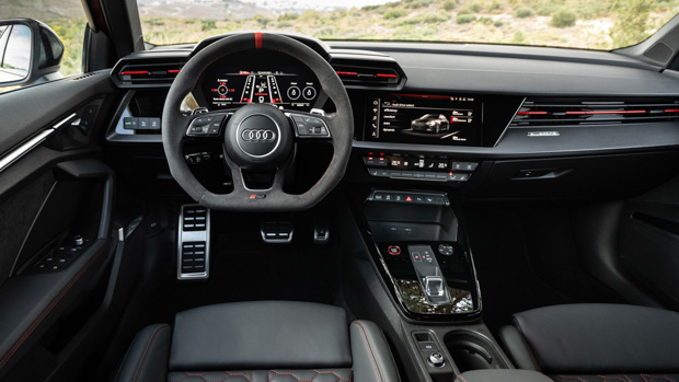 The RS3 is the Audi’s small car flagship and offers bulging standard equipment levels, with expected safety features such as a 360-camera and blind-spot alongside luxurious massage seats.