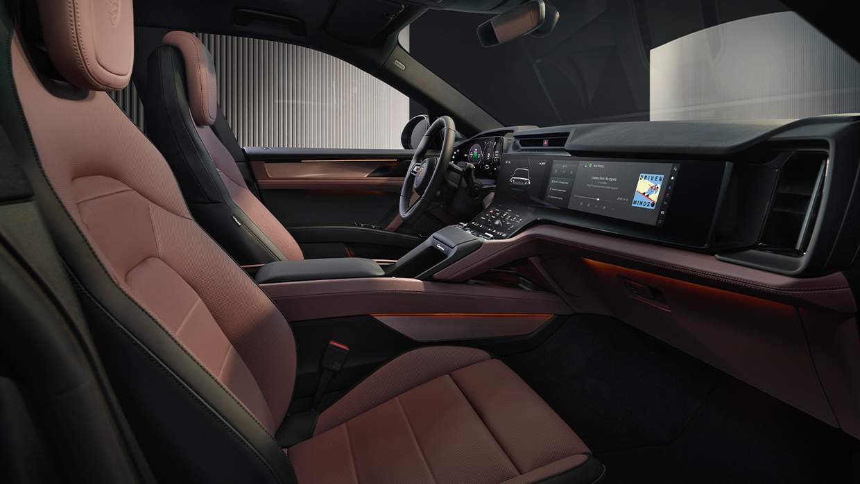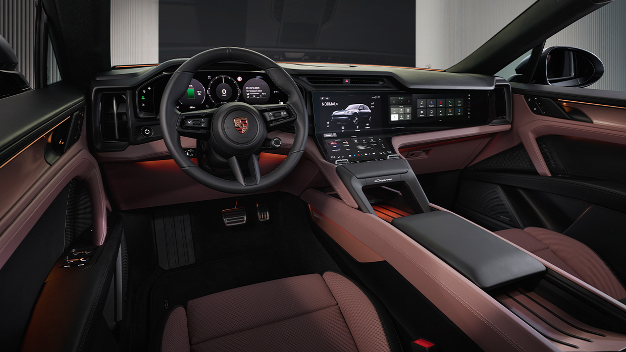 Inside, the Cayenne Electric is dominated by screens, with a 14.25-inch digital instrument cluster, optional 14.9-inch dedicated passenger touch screen, and a huge curved multimedia touchscreen between them, which follows the center console’s contours.