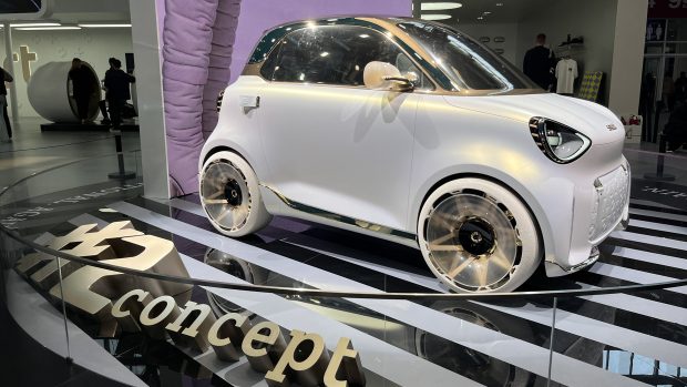 A bright white and gold-accented tiny two-door city car – the Smart #2 Concept – dropped jaws beside an overload of yacht-sized EVs on display.