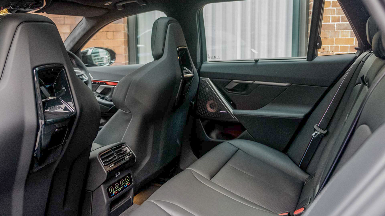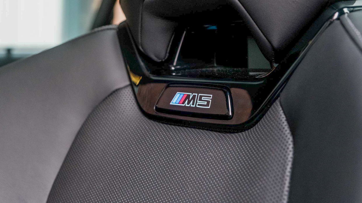 The back seat doesn’t rival an SUV for space but you’ll easily fit two adults in the back with a big glass roof letting light in and remarkably good toe room, given the M5 has to pack a battery.