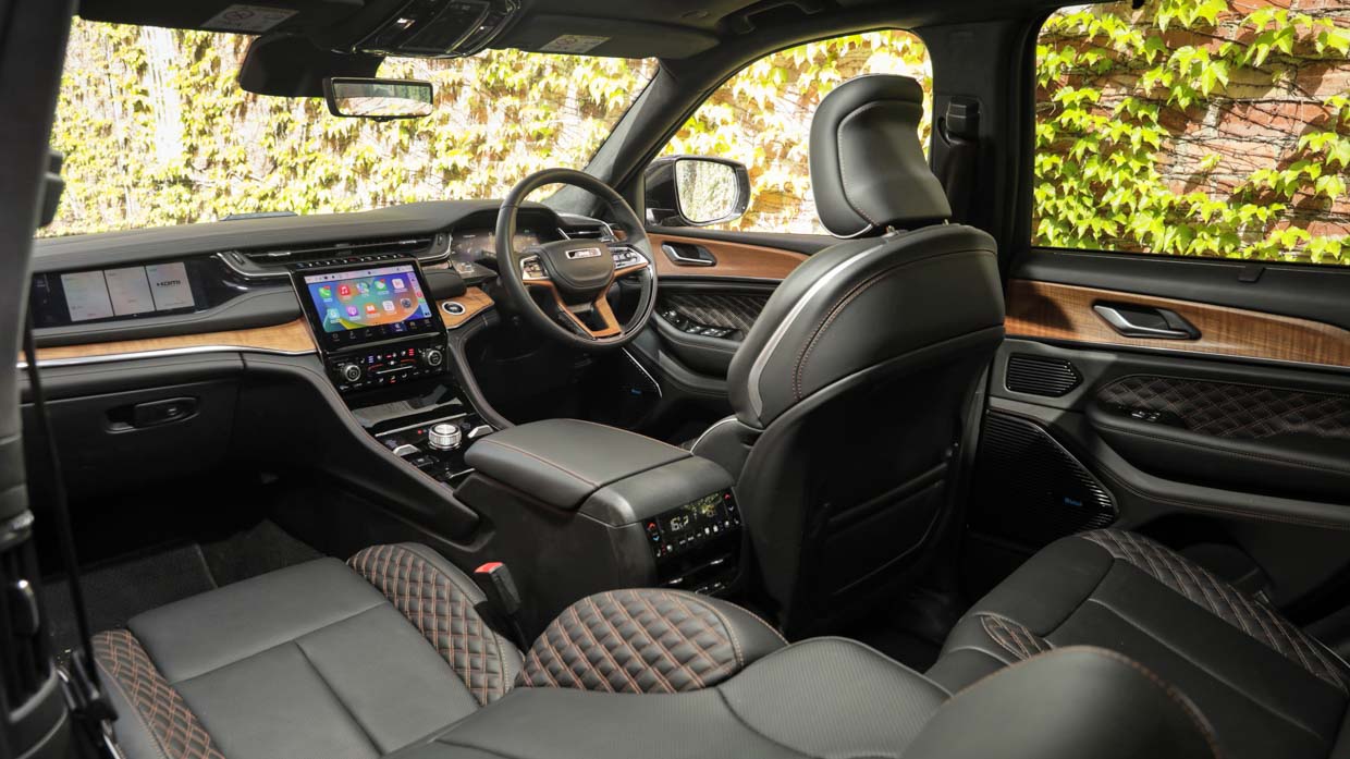 The 4xe has serious ‘poke your head in the window’ wow factor, with its triple dashboard screens, quilted tan leather upholstery, microsuede roof lining, wood trim inserts and light-filling full-length sunroof. It’s surely the most luxurious Jeep ever.