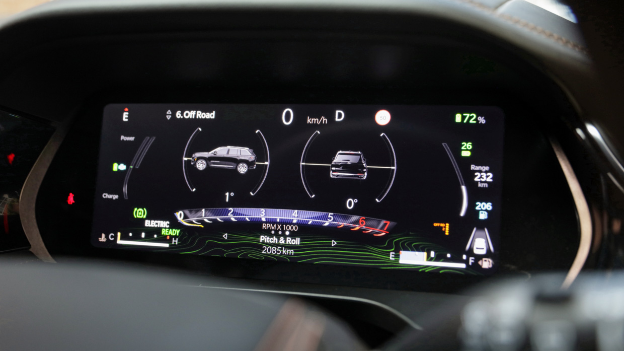 Inside, the 4xe’s 10.25-inch digital instrument cluster and 10.1-inch central touchscreen infotainment screens are standard across upper grades of the Grand Cherokee range, as is satellite navigation, wireless Apple CarPlay and wireless Android Auto.