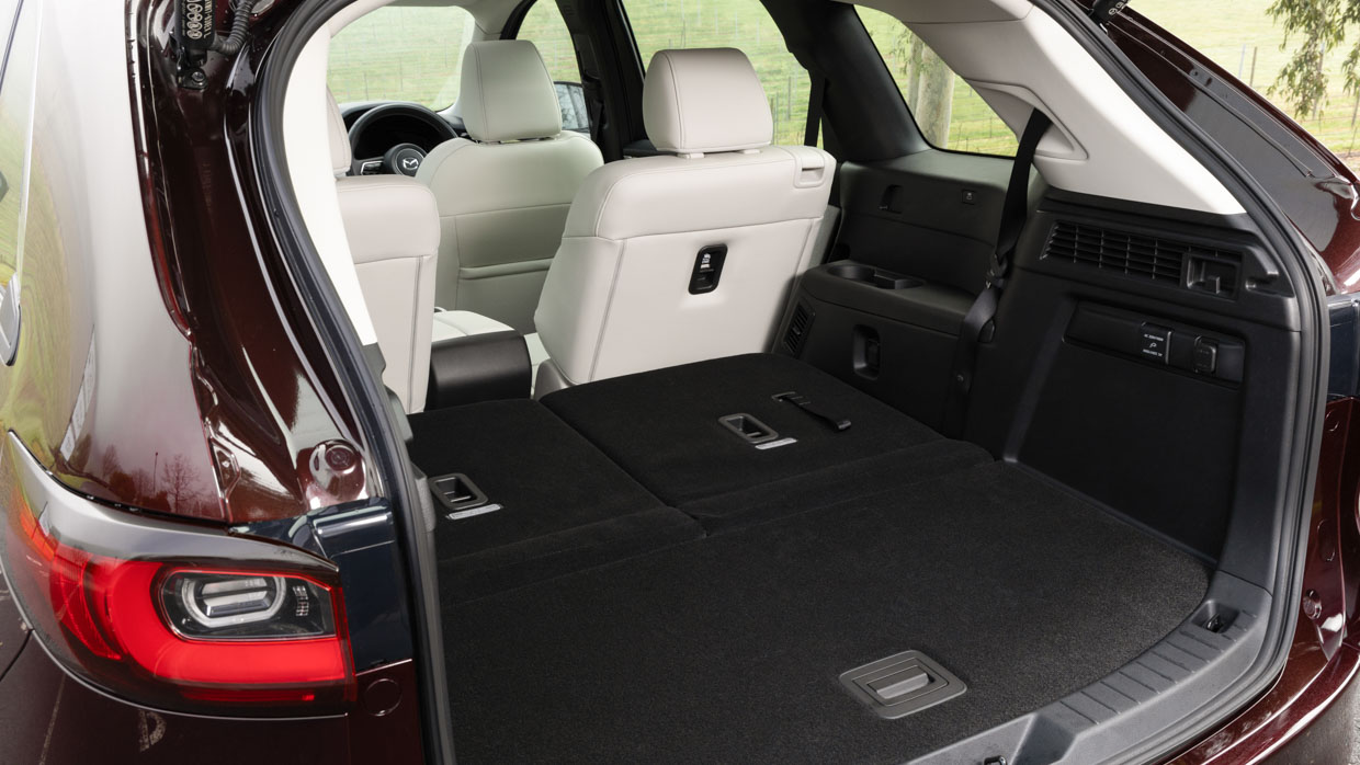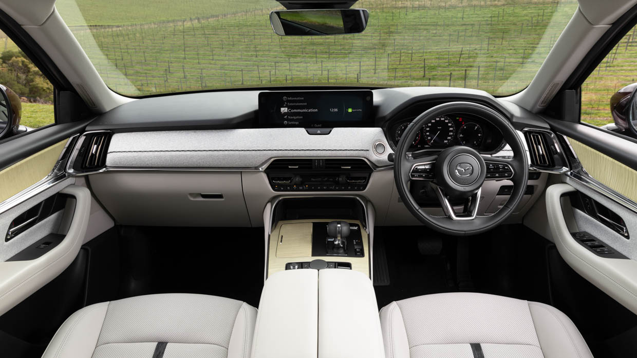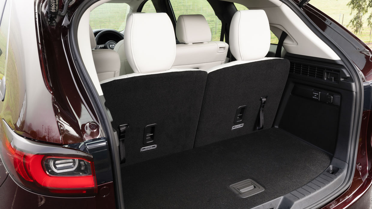 Wireless smartphone mirroring is standard for all CX-90s, as is USB-C charging, a 220-volt power socket, wireless device charging, navigation, digital radio, a head-up display, and a space-saver spare wheel.