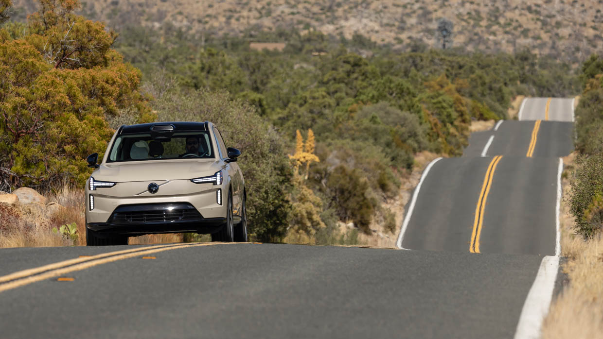 Even wearing 22-inch alloys with staggered-width Pirelli Scorpion tyres (huge 295/35R22s at the rear), the flagship EX90 proved impressively impervious on southern California’s expansion-jointed freeways and through its twisting, mountainous national parks.