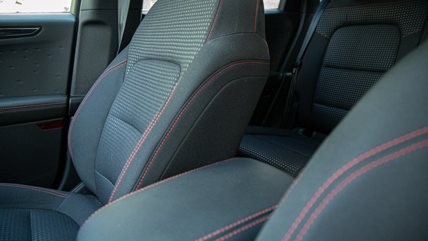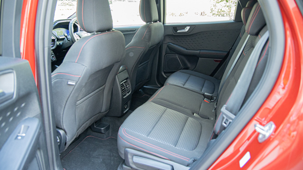 To be honest, the Escape ST-Line’s interior feels like a very European specification: there are plenty of features but it’s not fussy or luxurious. The seats are cloth and manually adjustable in eight ways, and there is rolling lumbar support. Unlike the all-grey base model, the ST-Line picks up red stitching on the pews and the leather steering wheel.