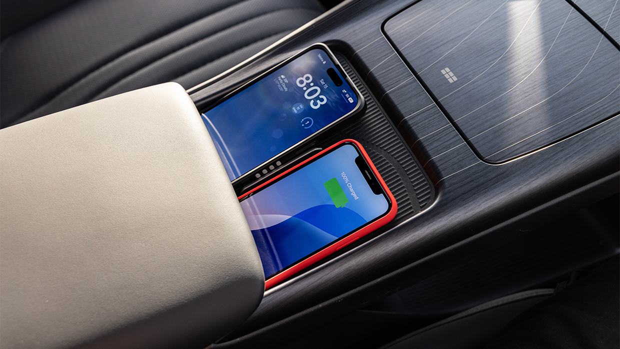 Elsewhere, the EX5 Inspire continues to be a mixed bag. The console rotary dial is configurable to different functionality – very clever – but the driver’s screen and HUD both display that Tesla-like vehicle proximity monitoring that should’ve stayed put in the Pointless Ideas bin. The large under-console storage cubby is plastic lined, where oddment tends to clatter about.