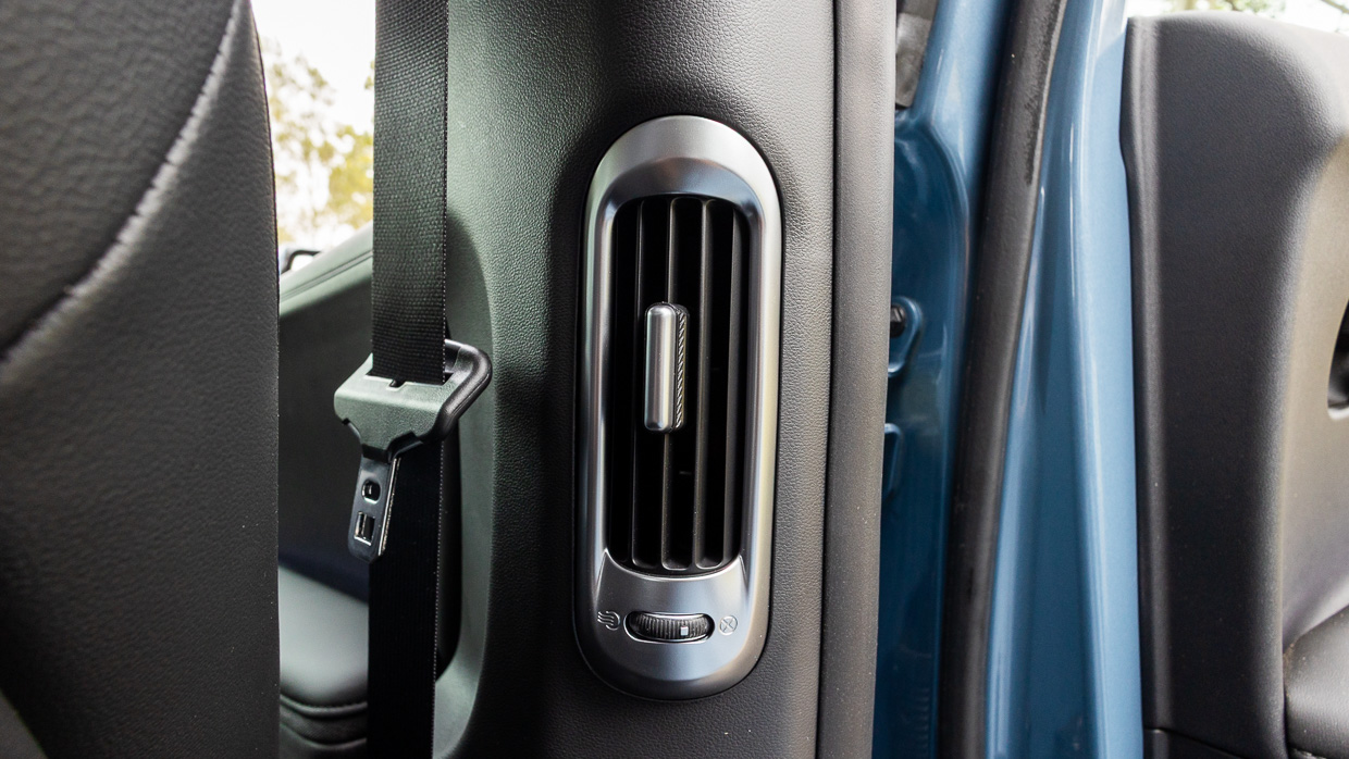 Rear air vents are located in the B-pillars, and if there’s one markdown it’s that the high floor (due to the battery pack) leaves under-thigh support a little lacking.