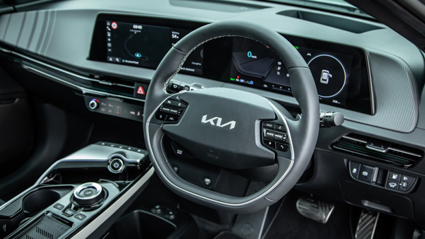Back to the Kia: the interior is visually impressive, with a huge, curved panel of twin 12.3-inch screens plus a trick floating centre console that integrates the power switch, direction selector, drive modes and other quick-access buttons.