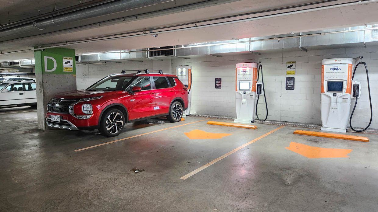 Pictured: the Outlander PHEV at the sole working charger at this three-strong station in central Sydney