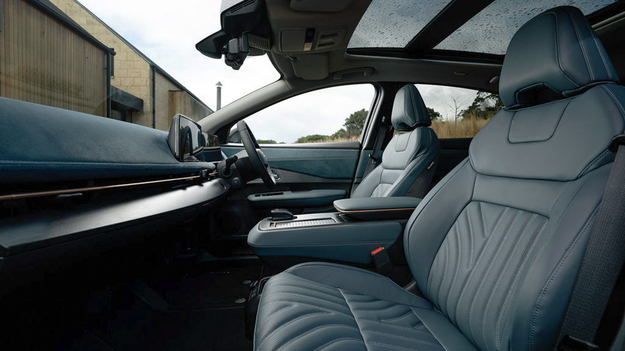 Best of all, the Ariya Evolve features lovely petrol-blue Nappa leather with stitched patterning, plus swathes of blue suede upholstery spread across its dash and seamlessly through the doors and B-pillar trim.