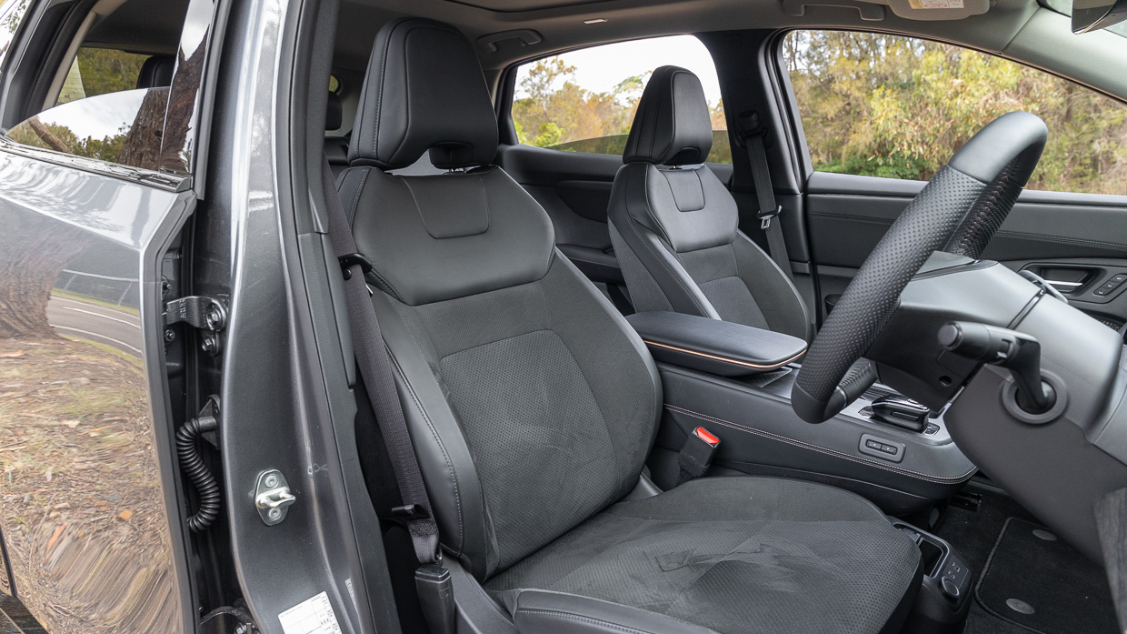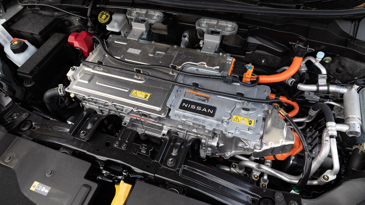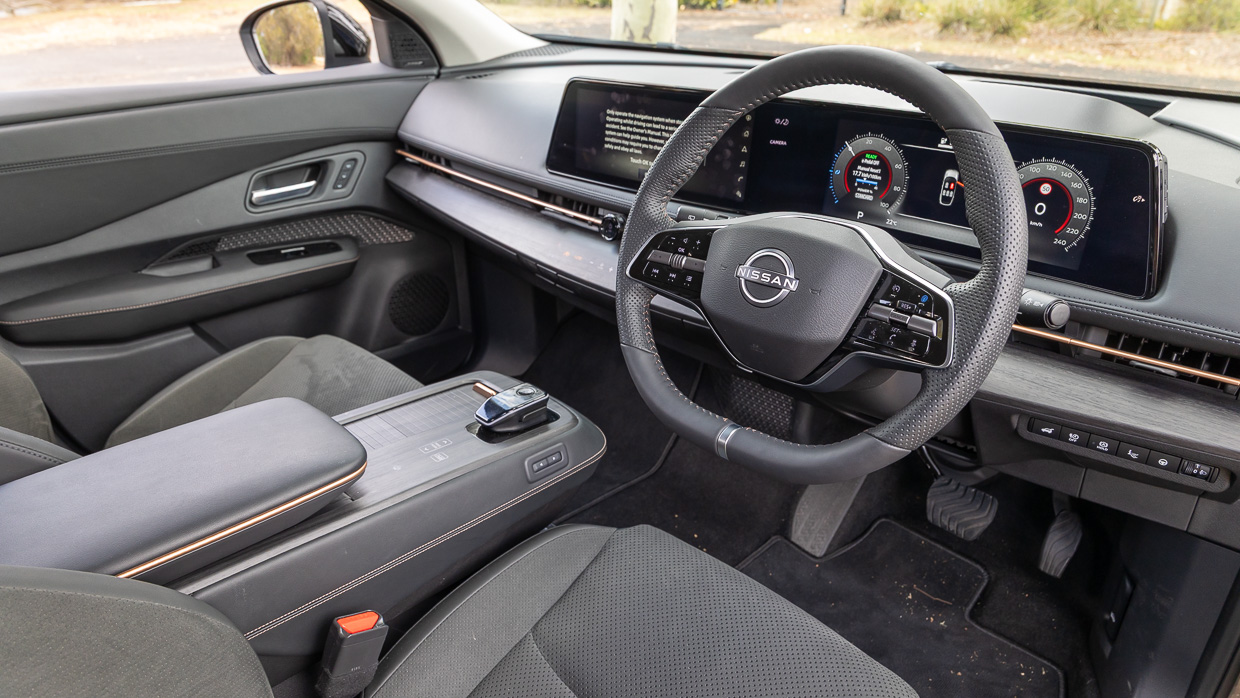 It’s not without novelty. The centre console slides electrically – if that’s your thing – and the hidden inductive charging pad and two-spoke wheel keep up with the electric Joneses to varying degrees. But from material choice to design language, this could be any other Nissan model, electric or not.