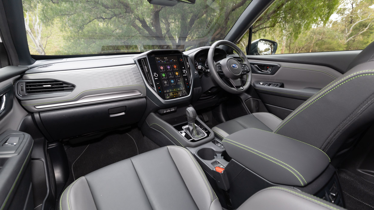 Along with the more frugal drivetrain, the hybrid option for the Sport adds a 12.3-inch digital instrument cluster with built-in maps functionality. It’s also the most visually striking of all the Forester models, with brown stitching on the seats and 19-inch bronze alloy wheels.