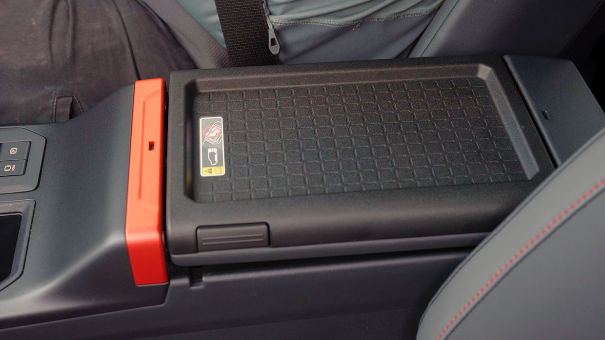 Amenities include a two-position reclinable backrest (as before), a fold-down armrest with two cup holders, a pair of USB-C charge points, two adjustable air vents and door bins. Materials are good in the back, including soft-touch on the door tops.