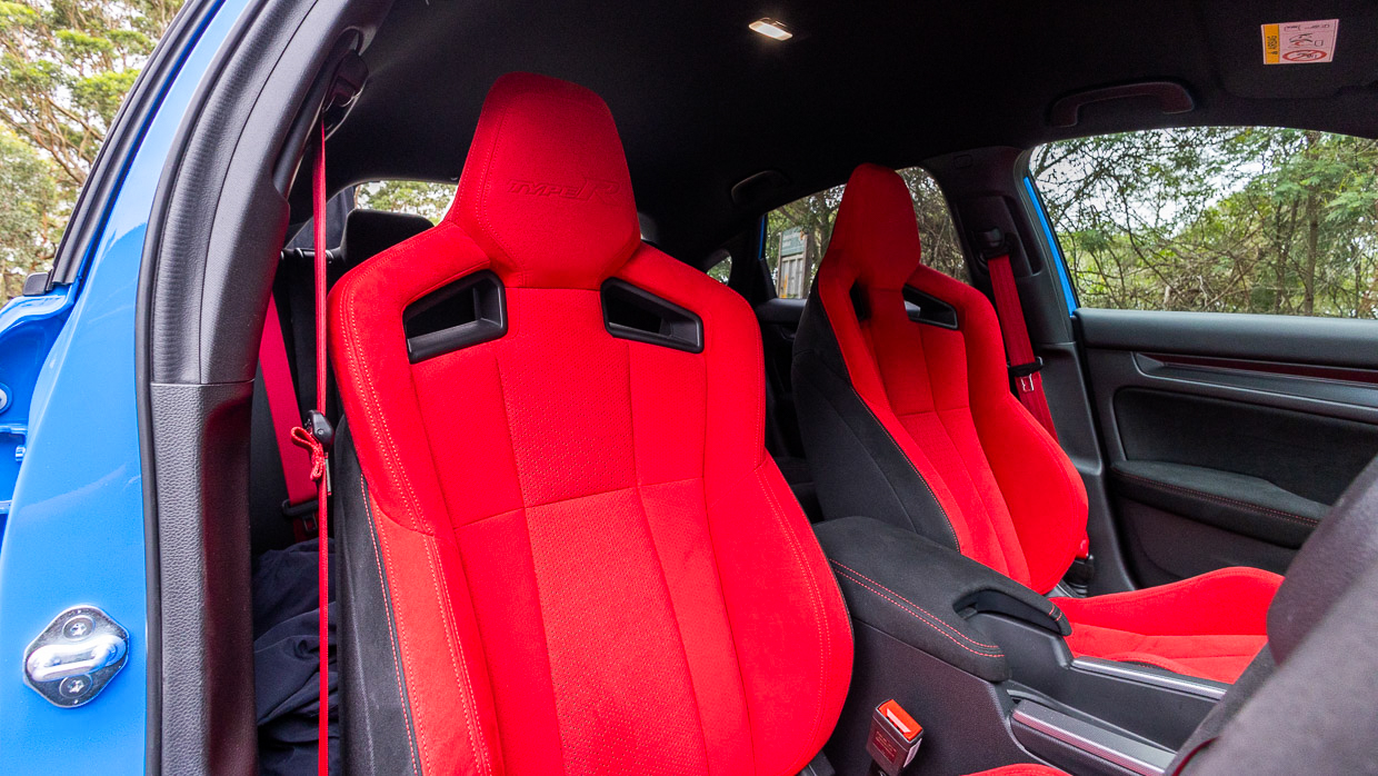 For a performance car, the four-seat Civic Type R offers generous room in the back seat. Adults under 180cm tall will be fine for headroom and there’s plenty of leg space. The backrest has reasonable bolstering, but the limpet-like Type R easily unsticks rear passengers.