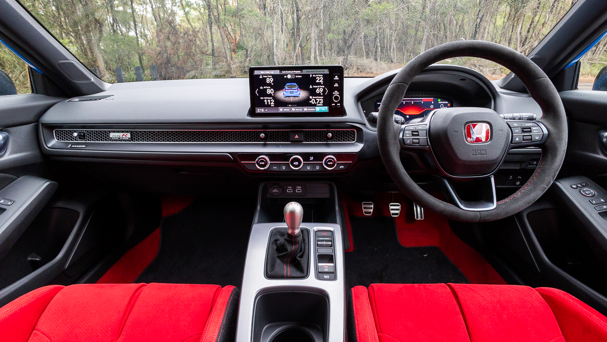 For that outlay you get manual-adjust seats without heating (okay, they are brilliantly snuggly red buckets), an unbranded sound system, a manual transmission and a 9.0-inch multimedia touchscreen. Oh, and in long-standing Civic Type R tradition, the FL5 is still ‘only’ front-wheel drive.
