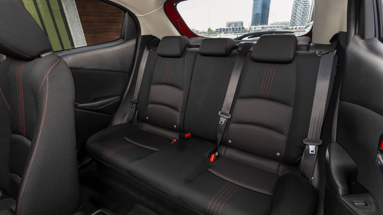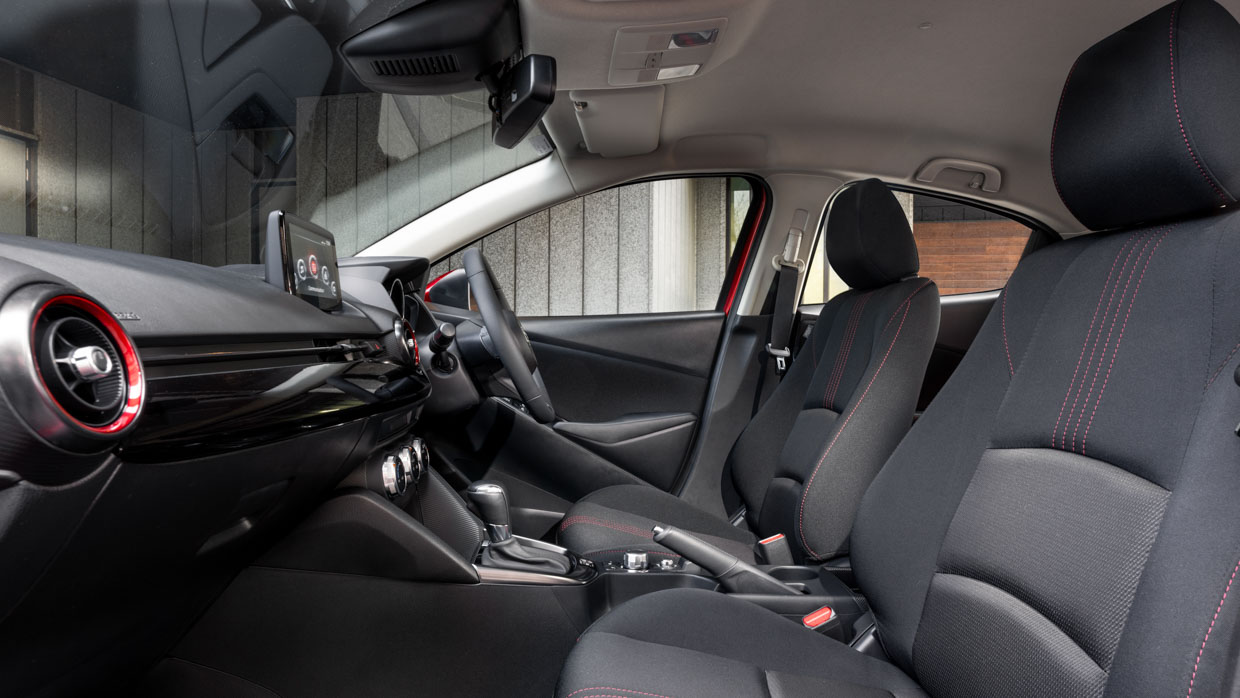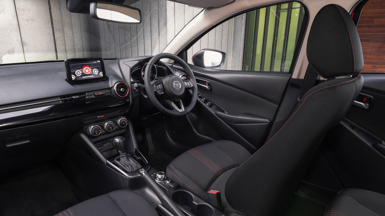 You now have climate control with better-finished knurled controls, while the seat trim’s livened up with red stitching. Sat nav and Mazda’s quite stick-on head-up display plastic panel arrive here too, so the local product planners expect this grade to account for over 40 per cent of all 2 sales.