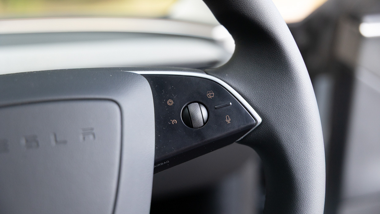 The high-beam flash and screen wash buttons are also on the steering wheel, and yes, our Model 3 randomly wiped its windscreen with no atmospheric water present.