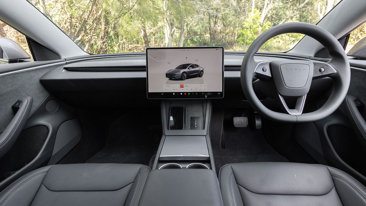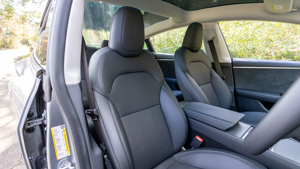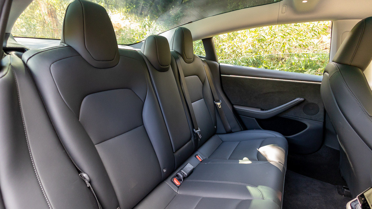 Material quality is elevated from the pre-facelift Model 3s with soft faux leather on the door tops and even below the belt line, both around the centre console and on door cards. This continues into the back seat, as do felt-lined door pockets that accept 1.5-litre water bottles.