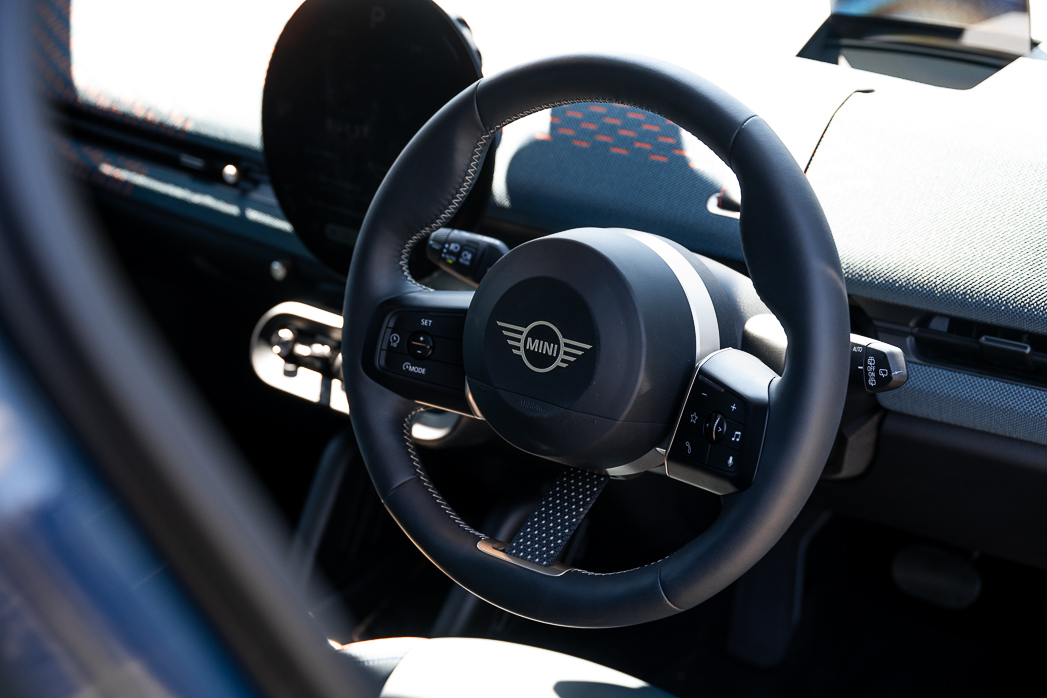 On sonics, the Mini presents a solution so simple you wonder why it’s not adopted by all feisty electrics: the synthesized soundtrack is paired with throttle position and acceleration, not with road speed. Bury your right foot and it returns a bold propulsion thrum – lift off the throttle and it goes politely quiet.
