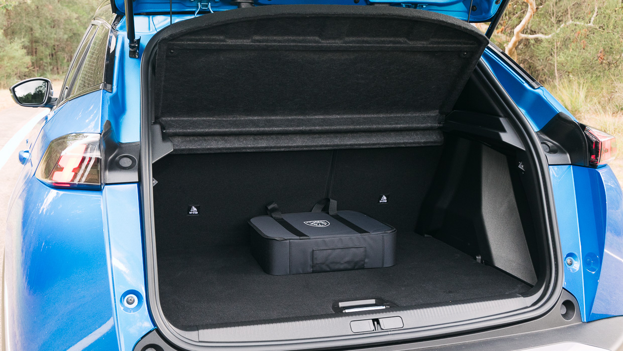 In terms of boot space, the E-2008 officially offers the same 434L as the petrol versions, though there is a caveat here. The EV fits a dual floor and the cubby space this creates is ideal for storing the EV’s charge cable. However, it does eat into overall luggage space for what is effectively a much smaller boot than its stablemates by comparison.