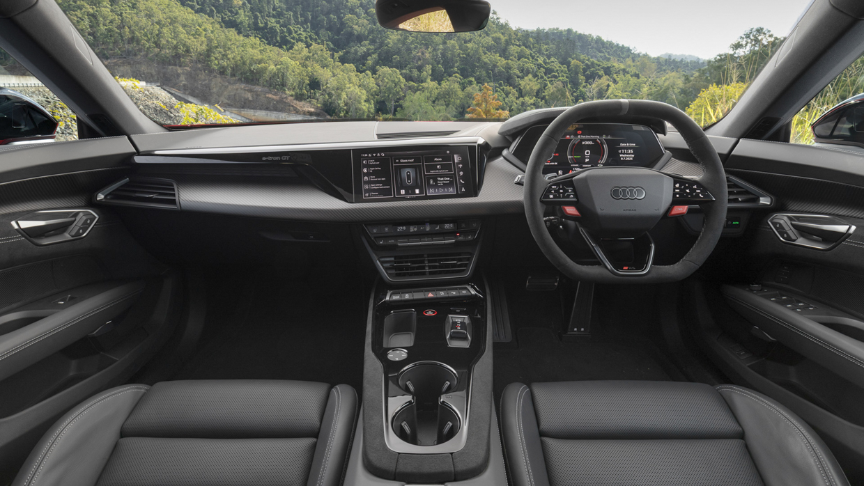 The body control for its 2.4-tonne heft is akin to black magic, and it rotates through tighter hairpins with aplomb; the E-Tron GT’s four-wheel steering system — up to 2.8 degrees of counter-steer below 50km/h — subtly flexing the chassis’ handling chops.