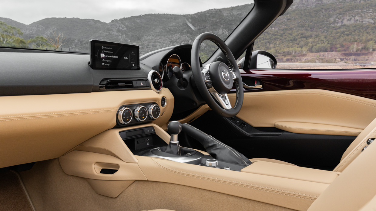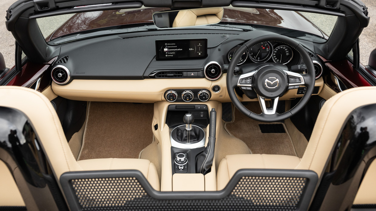New for the ND3 is an 8.8-inch widescreen sitting atop the dash; it’s bigger than the display it replaced but only in width, meaning visual clutter is reduced in our view. It runs Mazda’s latest OS and offers wireless smartphone mirroring, making it feel up to date.