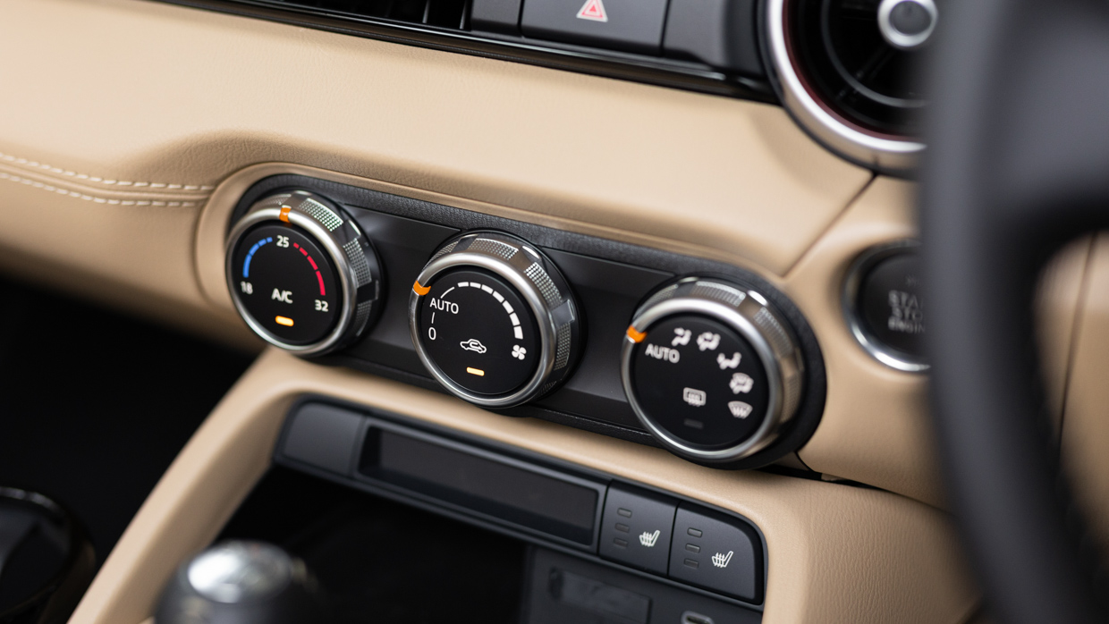What is not problematic in our view is the fact that the MX-5’s dashboard is essentially shared with the current — and very old — Mazda 2 hatch and CX-3 small SUV. It’s a simple setup with four air vents (three of them circular) and exceptionally clear knobs for the air conditioning.