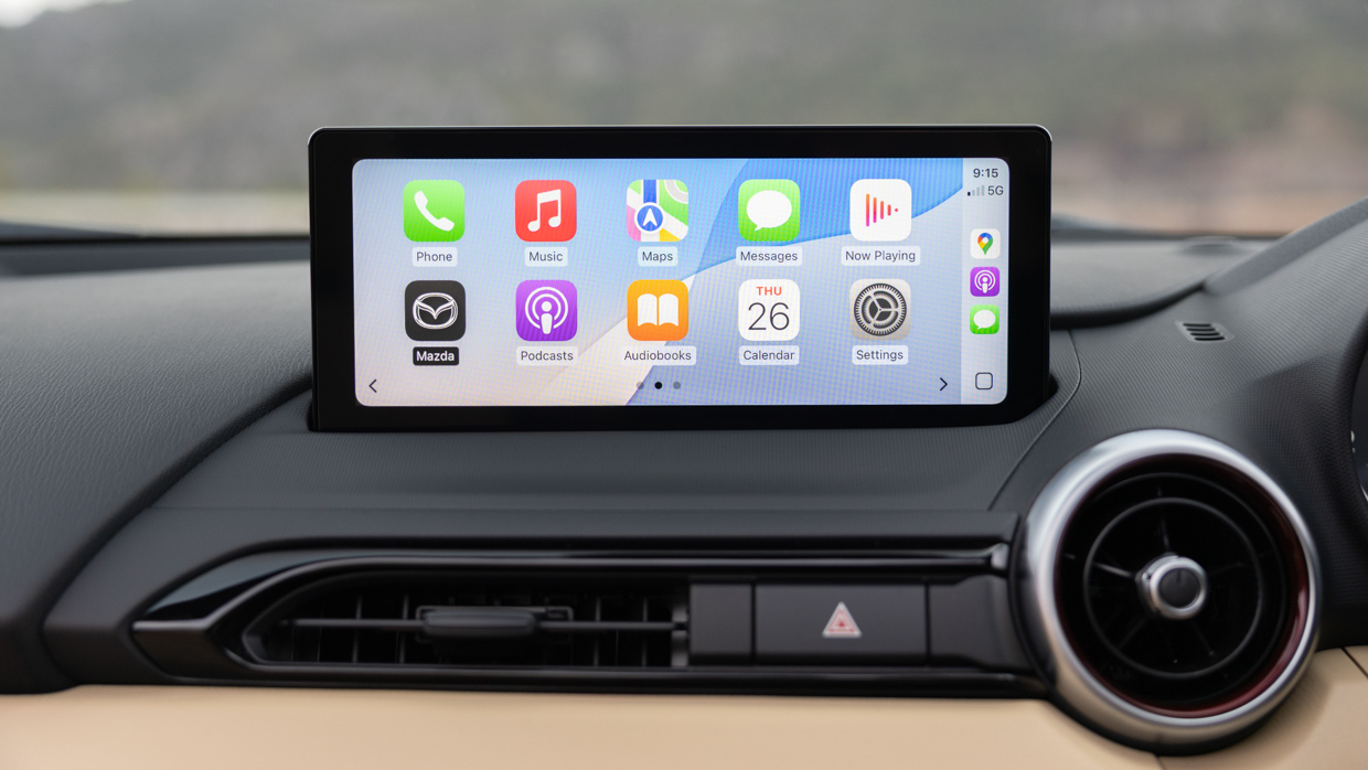 Standard kit for the base MX-5 includes 17-inch black alloy wheels, auto LED headlights and wipers, 8.8-inch infotainment display with navigation, DAB/AM/FM radio, wireless Apple CarPlay and Android Auto, single-zone climate control air conditioning, six-speaker stereo, auto-dim rear-view mirror and a Mazda connected services companion app.