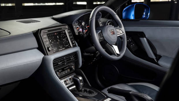It’s a vivid body – a hero colour for a hero car – and is matched to blue accents on the wheel spokes and blue finish to the quad titanium exhaust tips, the latter a standard feature across all MY20 GT-Rs.