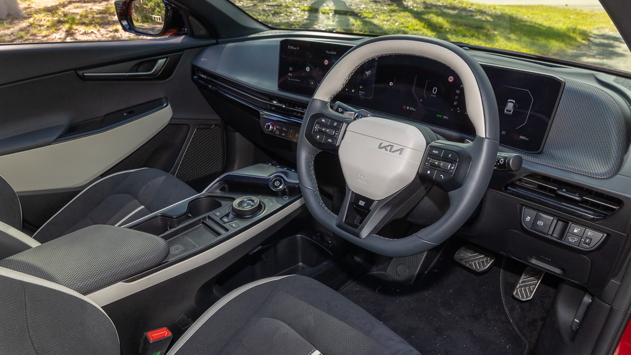 The EV9-inspired wheel goes some way to the effect, and the textured curves of the dash fascia and more neatly integrated dual 12.3-inch screen panel leaves EV6 looking less like yesteryear’s Sportage (as pre-facelift did).
