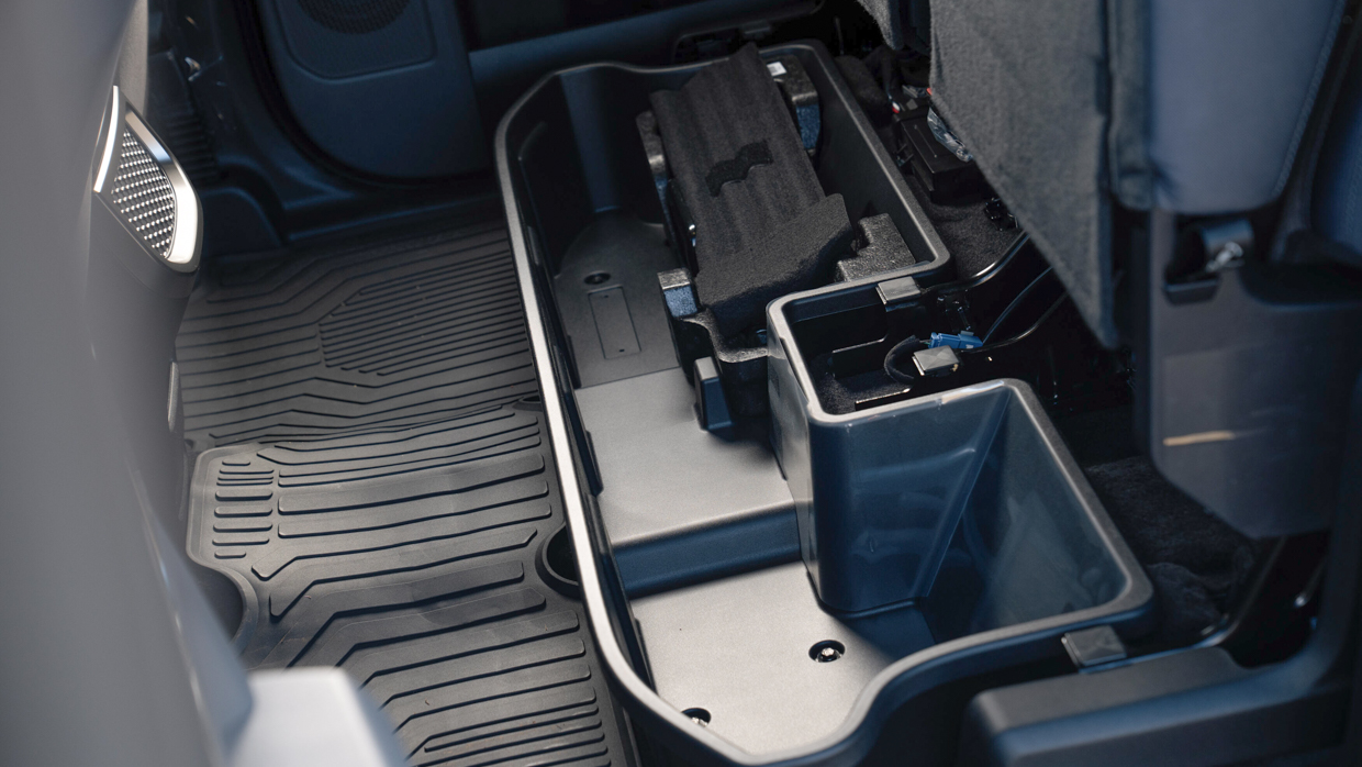 Storage space is a highlight with ample room in the cab with big cupholders and door bins, while under-seat boxes beneath the flip-up rear pews are handy for tools or keeping valuables out of sight. X-Line and X-Pro do add a handy table-style centre armrest, though.