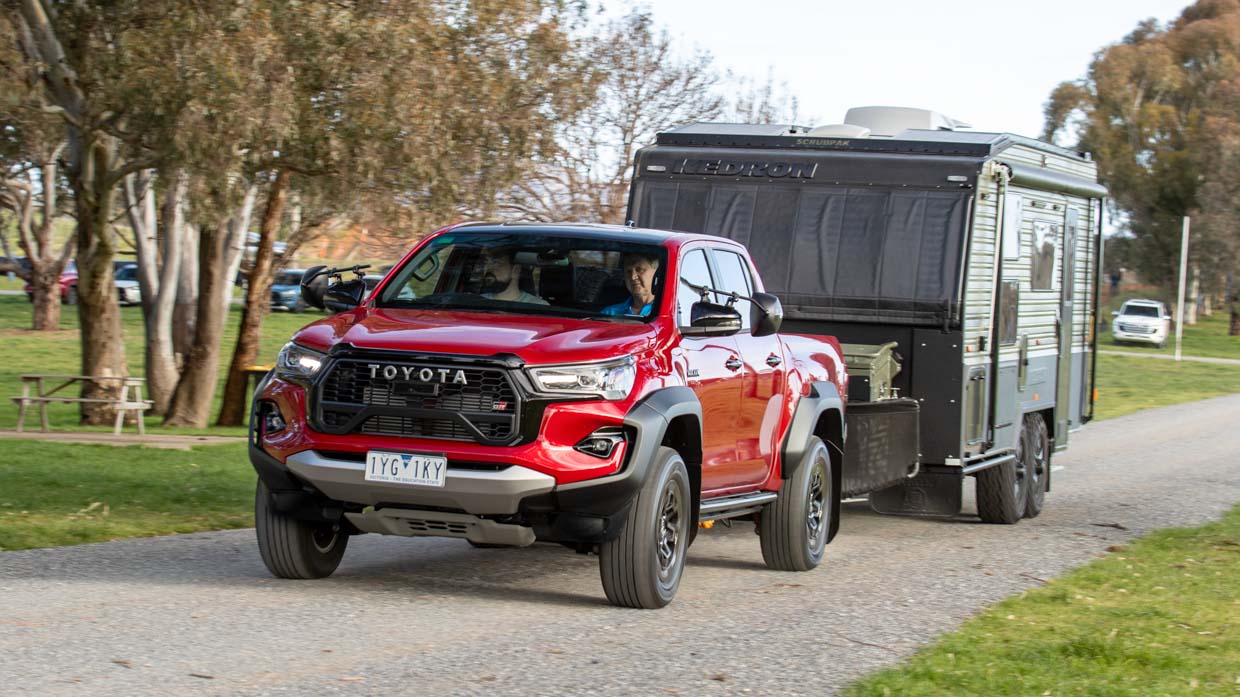 To demonstrate this capability, a 3.1-tonne caravan was hitched to the rear of the Hilux and four spare tyres were loaded into the tray, adding a weight of roughly 160kg.