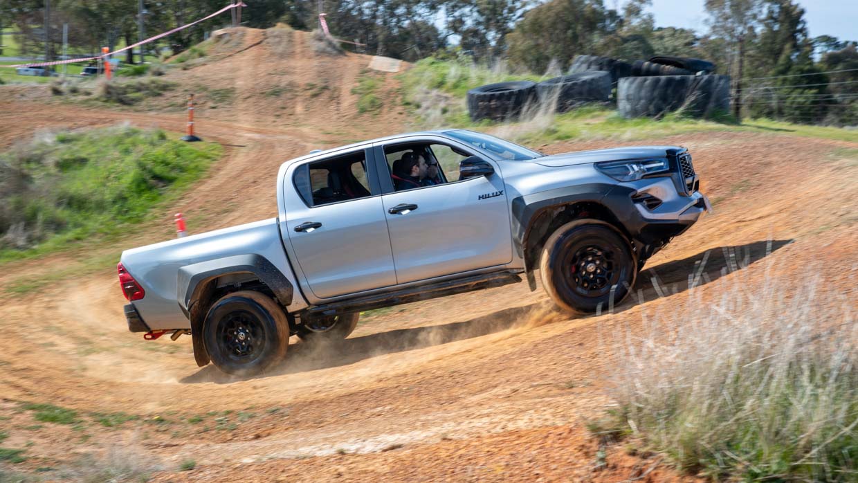 On dirt, the Hilux GR Sport begins to make more sense. Flick the driveline to four-wheel drive and Toyota’s Australian influence shines through. The Hilux’s well-tuned ESC combined with its wider stance provides a planted feel on the marble-like surface.